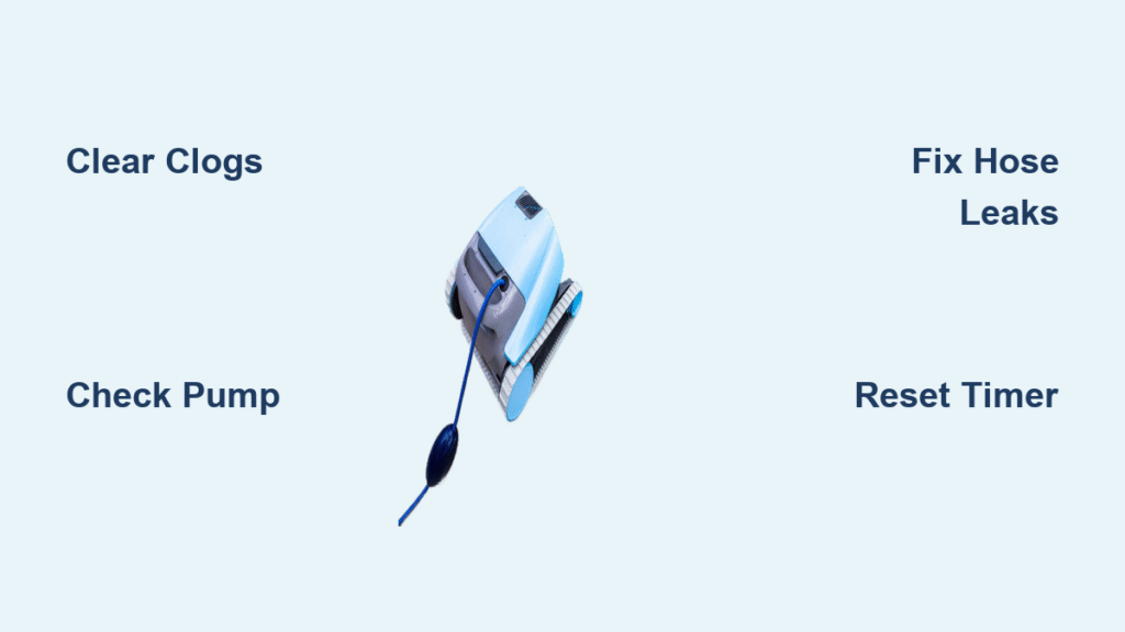 Inspect the vacuum head, hose, and skimmer basket for visible debris. Run water through the hose to check for resistance; if it feels weak, a clog is likely. Also, verify pool water level is at least halfway up the skimmer opening.